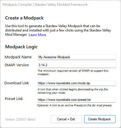 Simply click "Create Modpack" and select a suitable location to save it. Ta-da! You did it! You can now send this modpack file to anyone and they will be able to use it to download your modpack using the Stardew Valley Mod Manager and the Automatic Modpack Installer.